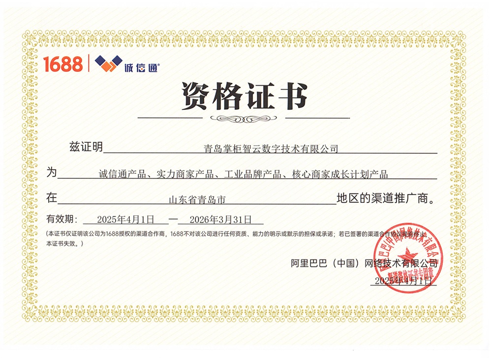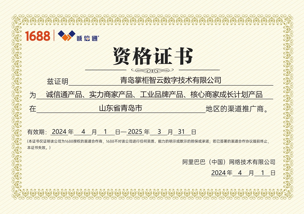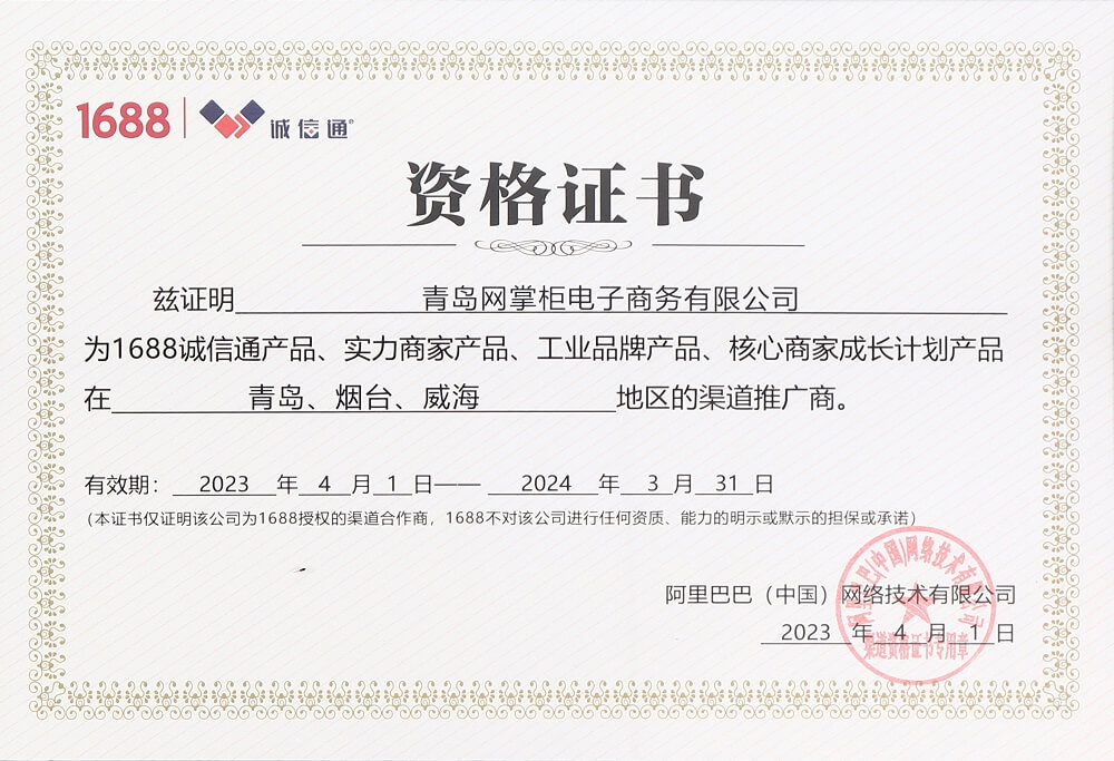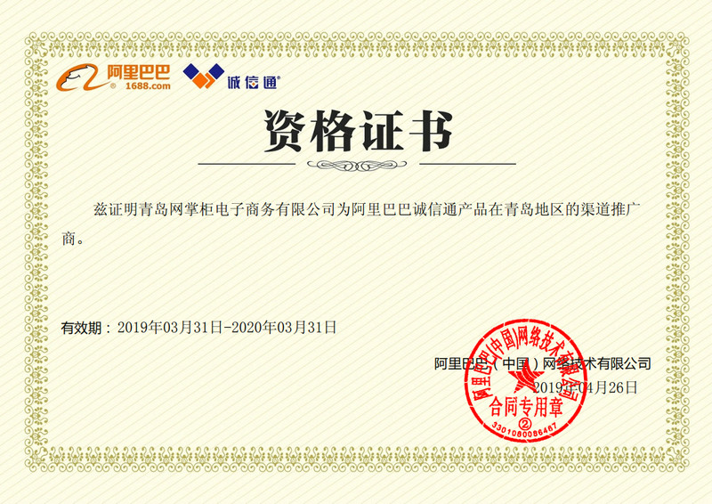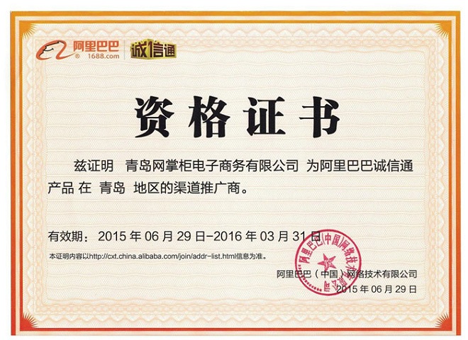 阿里巴巴诚信通青岛授权渠道推广商证书