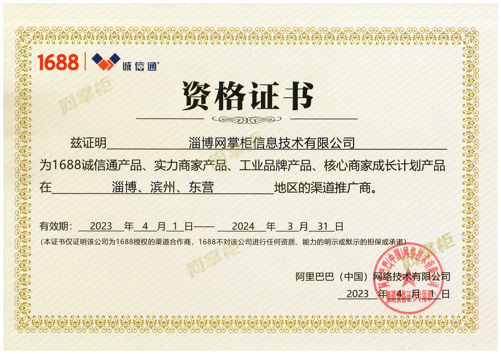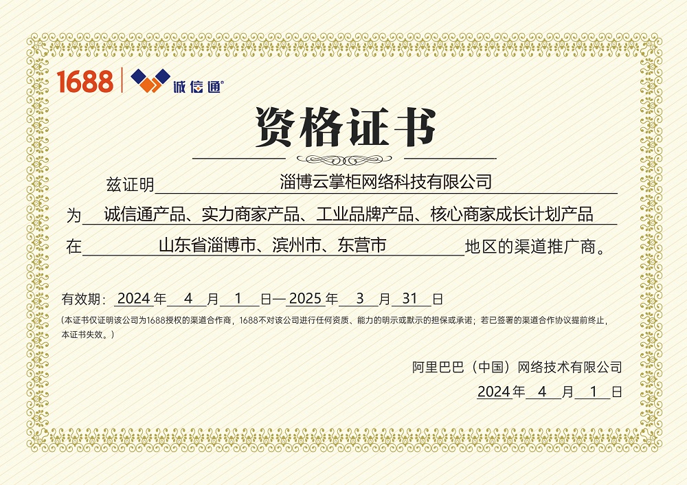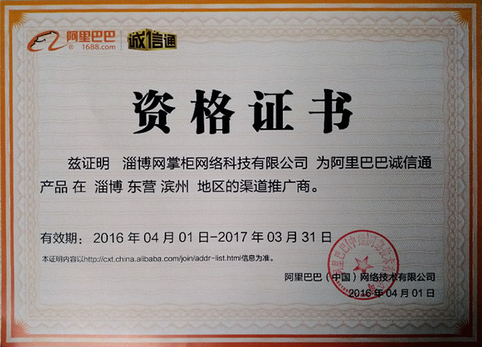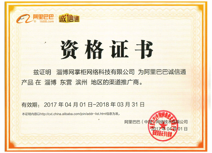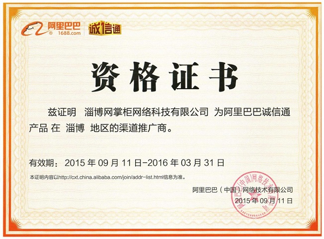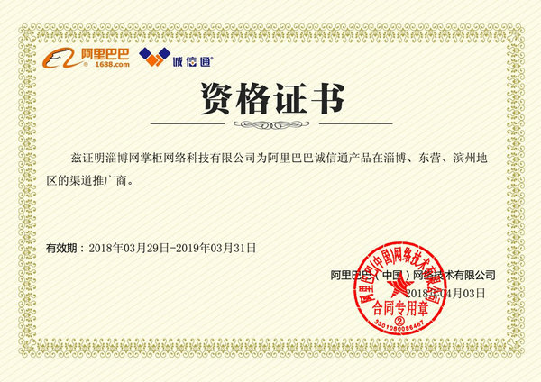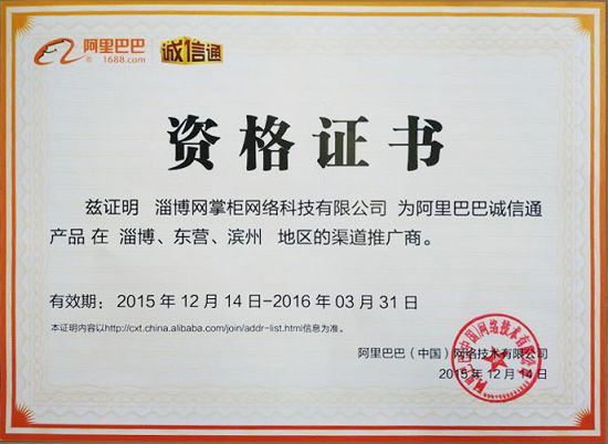 阿里巴巴诚信通淄博滨州东营授权渠道商证书