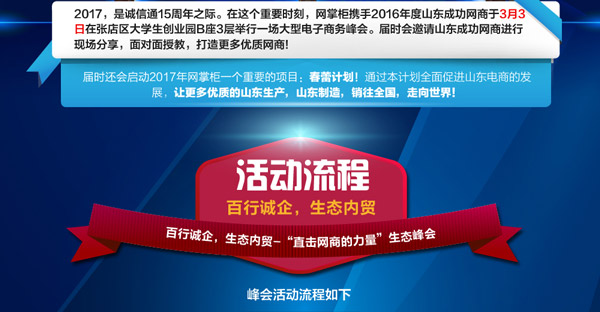 2017,是诚信通15周年之际。在这个重要时刻,网掌柜携手2016年度山东成功网商于3月3日在张店区大学生创业园B座3层举行一场大型电子商务峰会。届时会邀请山东成功网商进行现场分享,面对面授教,打造更多优质网商!届时还会启动2017年网掌柜一个重要的项目:春蕾计划!通过本计划全面促进山东电商的发展,让更多优质的山东生产,山东制造,销往全国,走向世界!