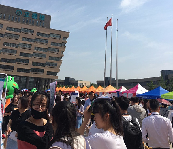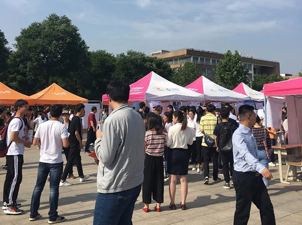 5月19日,顶着烈日阳光,网掌柜人力资源小姐姐们早早的来到校园招聘会现场给前来投递简历的学弟学妹们介绍岗位发展,以及公司文化等。